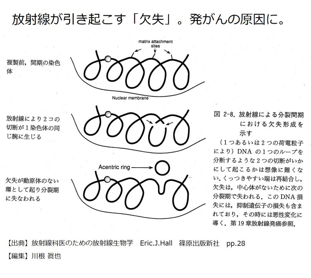 細胞の設計図であるDNAが放射線やフリーラジカルで切られた場合に、「欠失」が起こる場合があります。「放射線に特有なDNA損傷はない」とよく言われますが、実はこれも間違いです。「欠失」は放射線によるDNA損傷に特徴的なものです。
