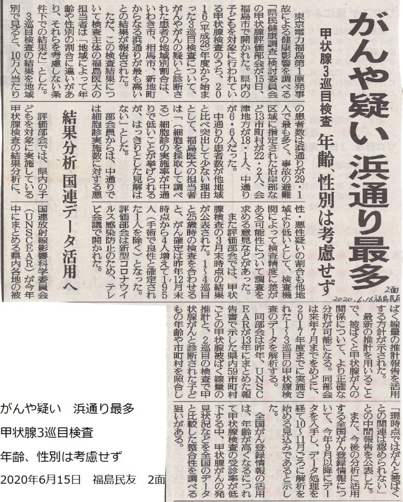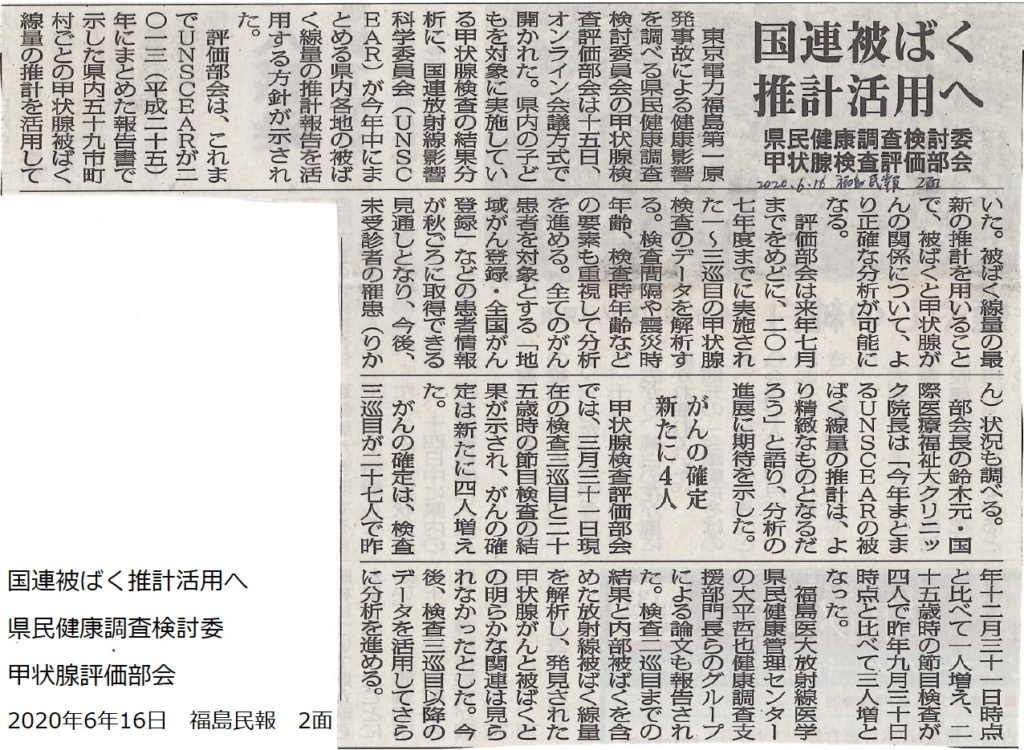 福島県「県民健康調査検討委員会」の甲状腺評価部会が2020年6月15日開かれました。以下が福島民友、福島民報、読売新聞の福島版の記事です。朝日新聞、毎日新聞は翌日6月16日の朝刊では、全国版でも福島版でも記事を書きませんでした。