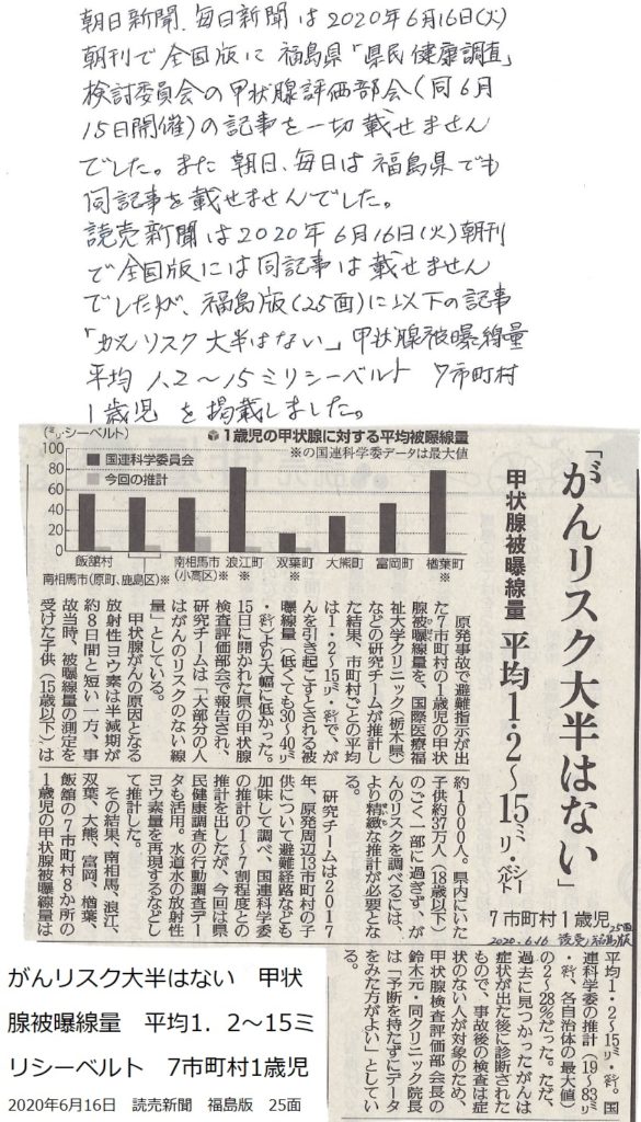 読売新聞は翌日6月16日の朝刊では、全国版では記事を書きませんでしたが、福島版では、『 がんリスク大半はない 甲状腺被曝線量 平均1.2~15ミリシーベルト 7市町村1歳児 』(同25面)に記事を書きました。