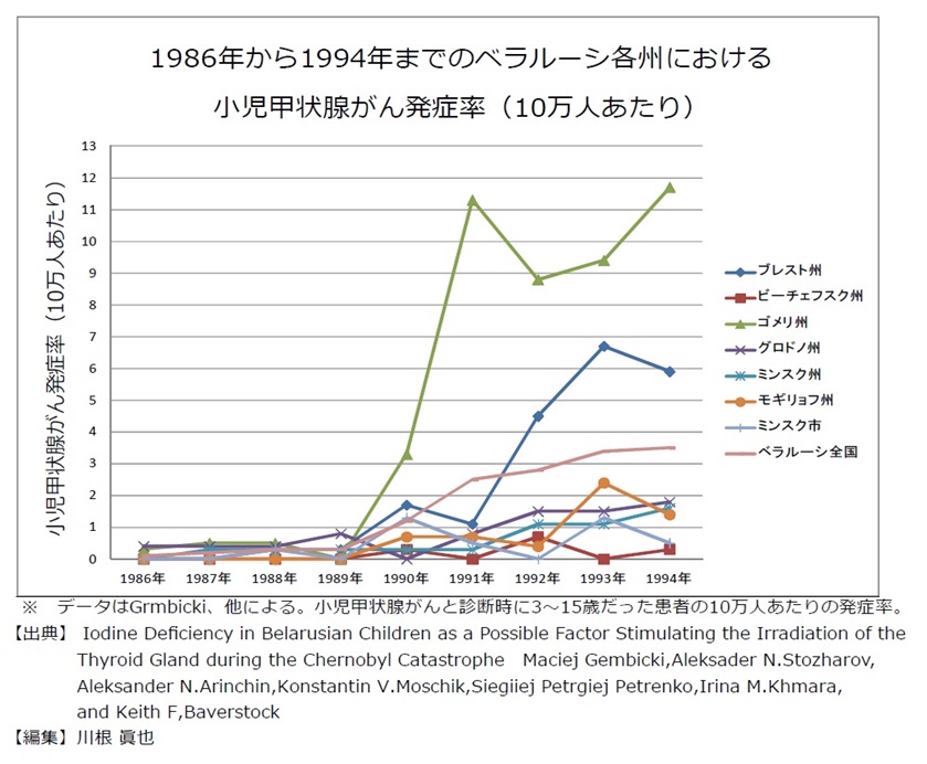 10万人あたりの罹患率にすると、対象者が38万人だから28÷38000×10000=7.3人/10万人あたり・年間。異常な発症率です。チェルノブイリ原発事故でもっとも放射能が降ったと言われるベラルーシの小児甲状腺がんの発症割合に匹敵する患者数です。 人/10万あたり・年間でのグラフが以下です。 ゴメリ州で原発事故5年目の1991年に11人。ブレスト州で原発事故7年目の1993年で7人です。福島県では、この7人の状況が9年間続いていることに匹敵します。