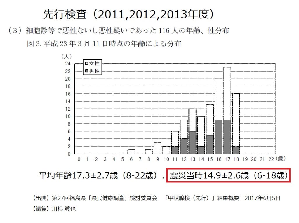 実は先行検査(原発事故のあった年2011年度~2013年度)の検査で、もっとも甲状腺がんを発症したのは、原発事故当時14.9歳の子どもたち。ちょうど中学3年生の世代で2011年3月16日は県公立高校の合格発表でした。3月15日、3月16日と言えば福島市でももっとも放射能ブルームが高かった時です。高校の合格発表を見に行き、合格手続きをした中学3年生の子どもたちは、1日屋外にいました。原発事故が起きたのだから今日は家にいてと両親から言われた子どももいます。今日の合格発表は危険だから延期してほしい、と校長に頼んだ高校教師もいます。しかし、避難指示の出ていた、双葉町、大熊町などの原発20km圏内以外は、2011年3月16日に県公立高校合格発表は強行されました。その日は福島市など雨も降っていました。中学3年生たちはその雨を浴び、放射能の空気を吸いました。その後も中学生、高校生は部活動をやっていました。郡山市は合唱がさかんで合唱部の部活動では校舎の外で2011年4月5月も合唱練習をするところがあった、といいます。この中学3年生と中学高校生の部活動をやっていた世代が、ヨウ素131をはじめとする放射能をもっとも多く吸っていたと考えられます。
