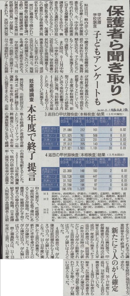(1)しかし報道するのは、地元紙、福島民報、福島民友だけです。朝日新聞、毎日新聞、読売新聞、日本経済新聞はガン無視しました。4紙はかつては2cm×3cmくらいのベタ記事で載せたこともありました。または、全国版では載せず、福島版でだけ記事を載せたこともありました。しかし、朝日毎日読売日経は翌日9月1日朝刊に、この245人の子どもたちの甲状腺がんの記事を書きませんでした。東京新聞も今回は記事を書きませんでした。