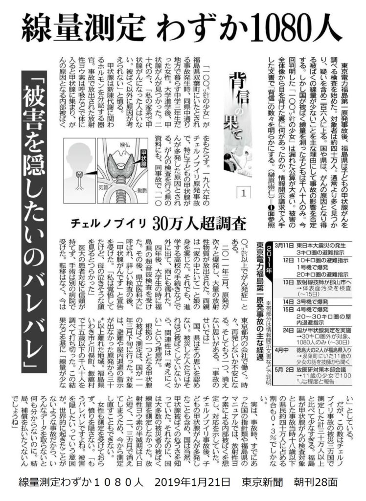 以下は、東京新聞2019年1月21日の記事ですが、福島県中通りに住む女性が大学生の時に甲状腺がんが見つかった、と言います。原発事故当時、中学3年生、原発事故直後だったので両親は「家にいて」と言いましたが、進学する高校の手続きで外に出て、雨にも濡れたと言います。