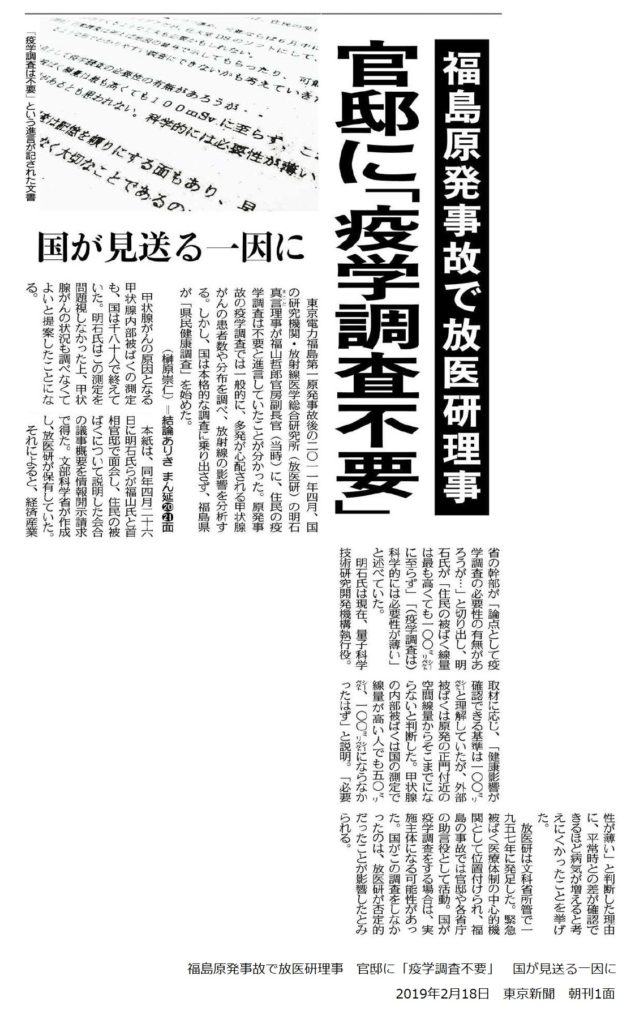 この明石真言氏は放射線医学総合研究所の理事でもあり、東電福島第一原発事故当時に、「福島県民に対する健康被害の疫学調査は必要ない」として、官邸に疫学調査を断念させた張本人です。東京新聞2019年2月18日が詳報しています。[記事1]