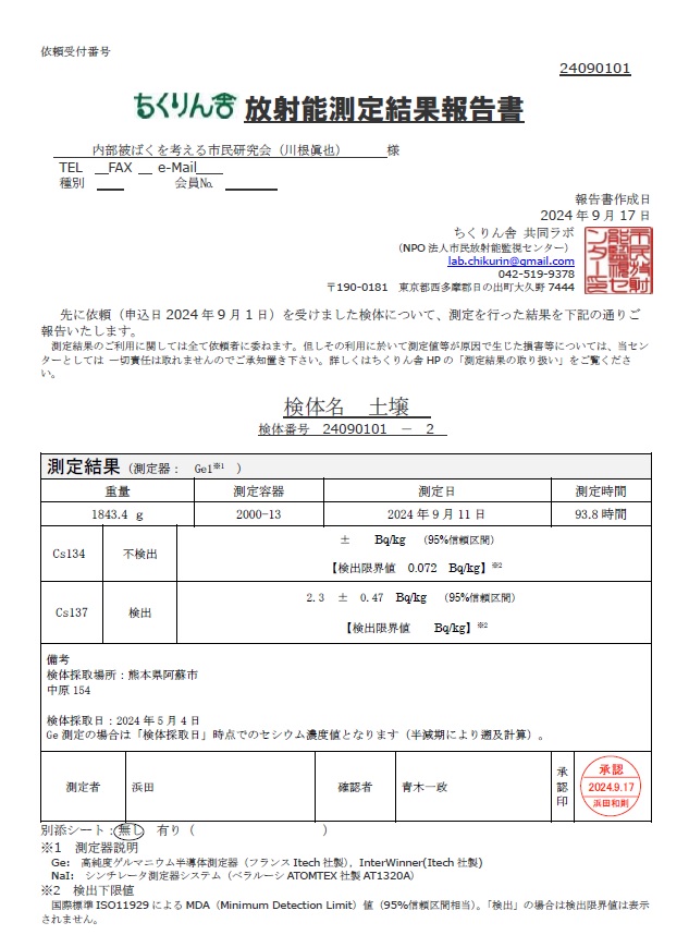 阿蘇のコシヒカリの農家さんのご紹介 2020 水田土壌はセシウム137 1.7ベクレル/kg セシウム134は不検出(<0.094)