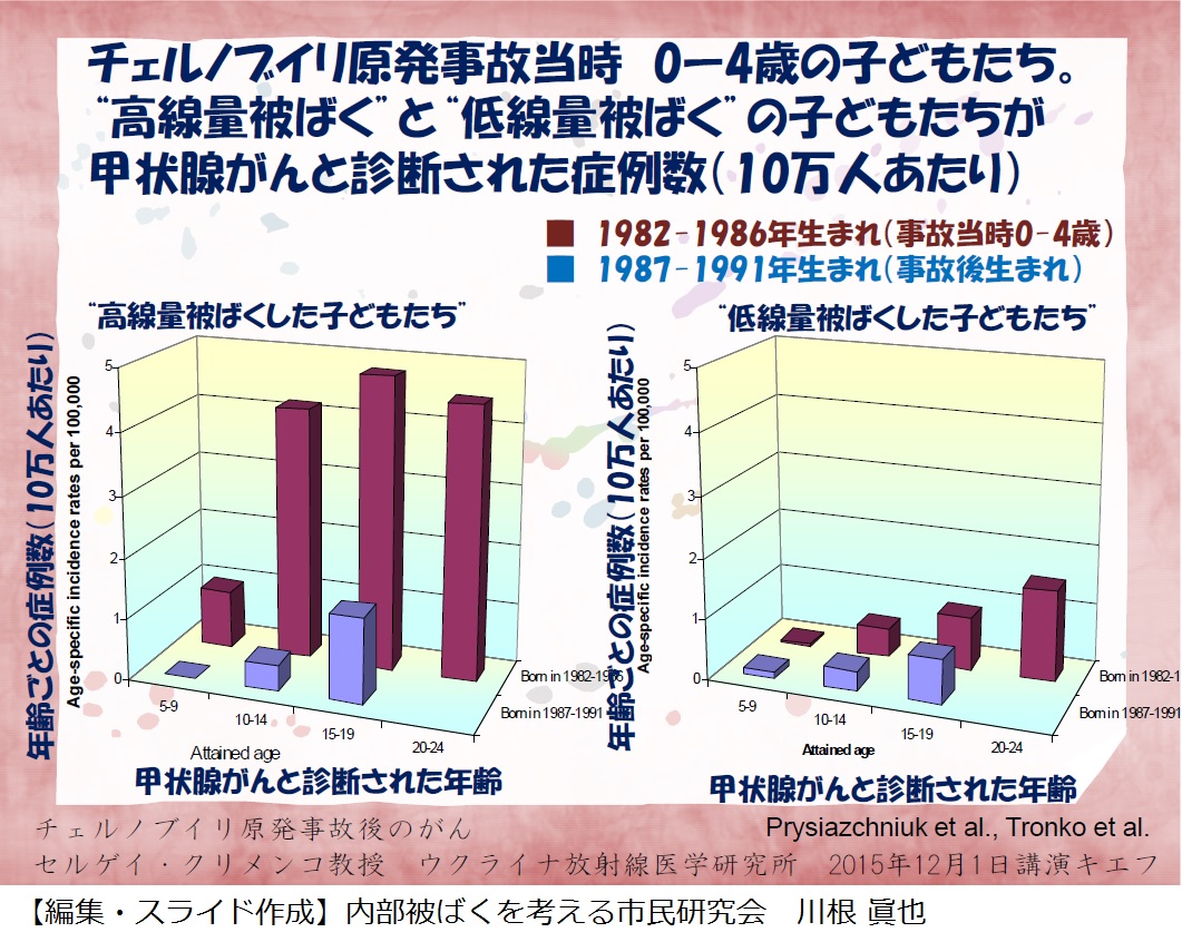 一方、ベラルーシで子どもたちの甲状腺疾患の診断と治療に勢力的に働かれたエフゲニー・P・デミチック博士、ユーリ・E・デミチック博士は、こう論文に書いています。Thyroid cancer in