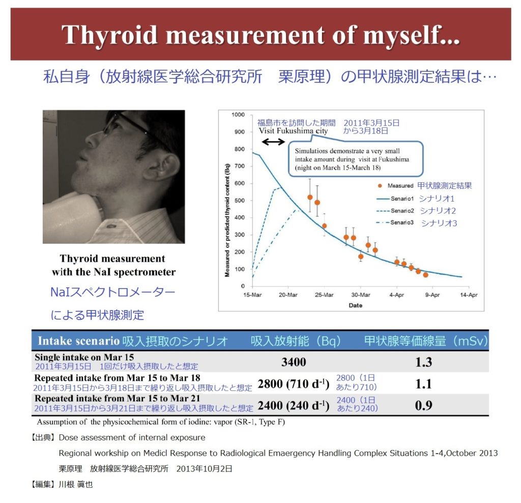 私自身(放射線医学総合研究所 栗原理)の甲状腺測定結果は… 栗原理 Dose assessment of internal exposure Reconstruction of early internal dose to Fukushima residents 第2回放射線医学総合研究所シンポジウム 2013年1月27日