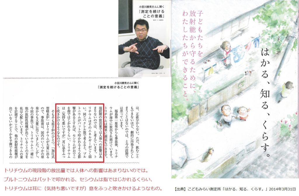 東京大学助教の小豆川勝見氏も、市民放射能測定室の測定に協力しつつ、市民団体の作ったパンフレットで「現段階での放出量では人体への影響はあまりない。トリチウムはそのエネルギーがごく弱い。同じベクレル数で考えると、プルトニウムがバットで叩かれるくらいの影響がるとすれば、セシウムがおでこを指ではじかれるくらい、トリチウムは見耳に息をふっと吹きかけるようなものです」と語っています。