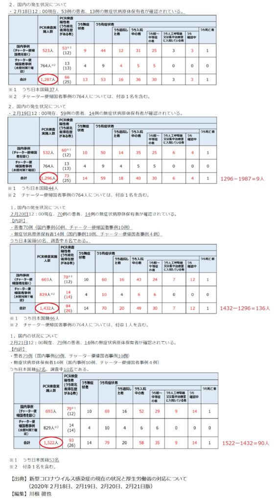 新型コロナウィルス感染者のPCR検査でも同じことが起きています。韓国は2月21日の感染者は204人から2月22日433人と倍増しました。しかし、韓国はPCR検査を毎日2000人規模を行っています。一方、日本では。厚生労働省がまとめた集計では 2月19日はたった9人、2月19日にも136人、2月20日は80人だけです。 「新型コロナウイルス感染症の現在の状況と厚生労働省の対応について」2月18日版、2月19日版、2月20日、2月21日版より 。「湖北省しばり」「浙江省しばり」で、中国の湖北省や浙江省からの中国人や帰国者などとの濃厚接触がない場合は、保健所、つまり厚生労働省がPCR検査を拒否しているのです。