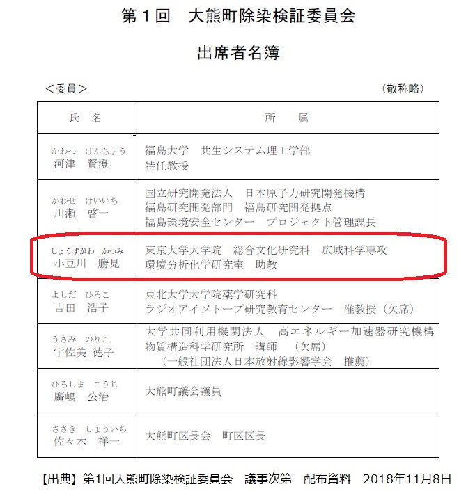 昨年2019年4月10日に東京電力福島第一原発の立地自治体である、大熊町の34%が避難指示解除されました。そのプルトニウムやストロンチウム90汚染もある大熊町の避難指示解除にお墨付きを与えたのが、「大熊町除染検証委員会」。そして、この小豆川勝見氏は「大熊町除染検証委員会」の委員でした。日本で市民の側にたってストロンチウム90の測定を行う風であった、小豆川勝見氏が「大丈夫」と言うことによる、町民の安心効果を狙ったものだ、と思われます。